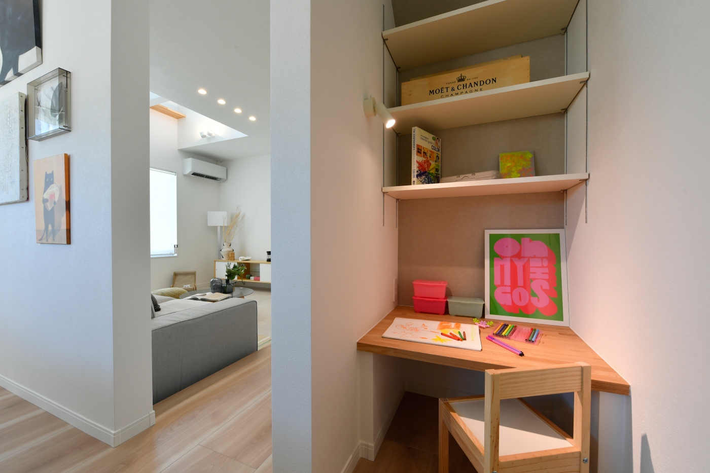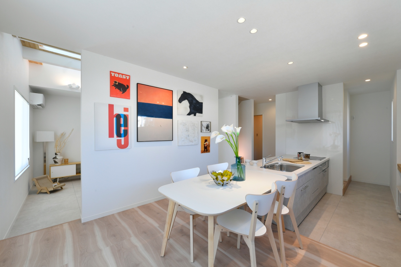 大きく広い独立した壁面は、ミュージアム風にアートをたくさん飾って楽しめます。ダイニングテーブルとの組み合わせで、キッチンとフラットな広いダイニングを実現。