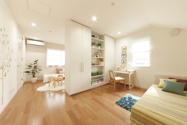 子ども部屋は最初から個室を用意するのではなく、広めの部屋を設けて後から仕切れるようにする設計が支持されています。例えば、12畳の部屋を2つの6畳部屋に分けられるようにしておくと、兄弟が小さいうちは一緒に使い、成長してからは個室に分けることが可能です。