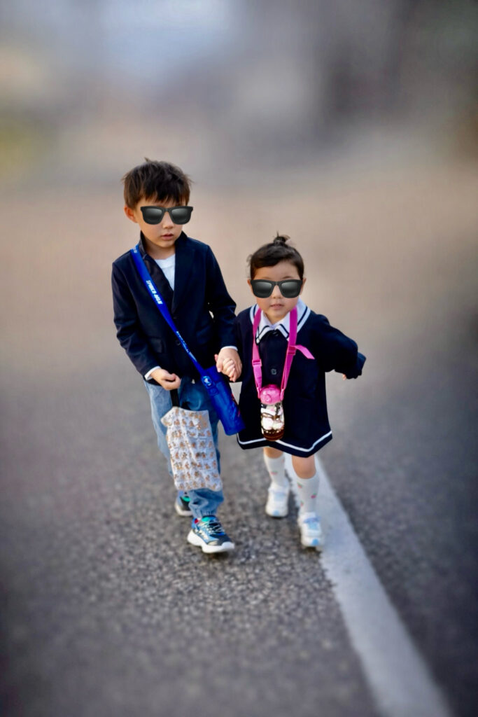 今年年長になった兄と手をつなぎ、ピカピカの制服で歩いて登園♪